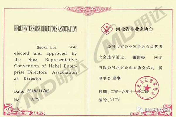 河北省企业家协会是全省种种所有制企业有成绩的企业家为主体的社会整体。。。。。雷国玺董事长是继2013年中选河北省企业家协会第八届理事会理事之后,,,,,再次中选这一职务。。。。。